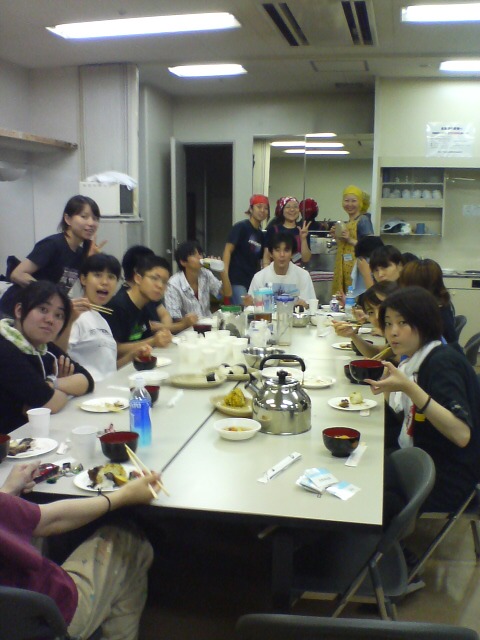 で、今日は舞台装置作りに終始したのですが、厨房では炊き出しが行われ、昼はカレー、夜はおにぎりと豚汁・煮つけ・玉子焼き等のお惣菜でした。