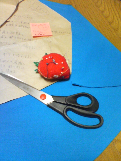 るぅさんが作った完成見本と親切な説明付きの型紙を広げ、作業を開始します。縫い代の取り方や、使う糸などの指示が書いてあって、そのまんま作ればいいようにしてあります。さすがるぅさん♪